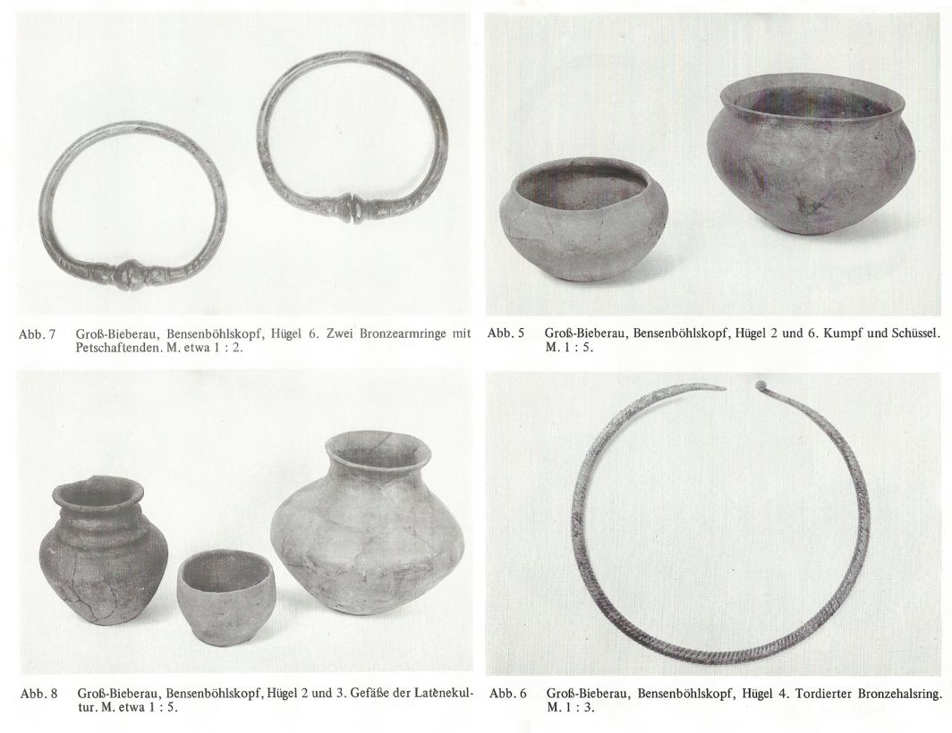 Wie bei fast allen Grabhügeln am Bensenböhlskopf fand man auch hier die Zentralbestattung von Grabräubern auseinandergerissen und ausgeraubt vor, konnte aber bei den restlichen Grabstellen diverses Fundmaterial sichern. Eine Bronze-Radnadel (die auch zum Vereinssymbol der AVA wurde), eine Halskette mit sechs Spiralröhrchen und drei Bernstein-Perlen sowie Fragmente einer Armspirale gehören zu einem Frauengrab aus der Hügelgräberkultur (frühe/mittlere BZ um 1500 v.Chr). Das graue Tongefäß aus einem benachbarten Grab desselben Hügels stammt aus der Urnenfelderkultur (späte BZ um 1000 v.Chr.) und die Arm- und Beinringe eines weiteren Grabs aus der späten Hallstattkultur (mittlere Eisenzeit um 500 v.Chr.). Man bezeichnet diese Praxis als Nachbestattung. Dazu tiefte man den älteren Grabhügel an einer Stelle ein und vergrößerte ihn nach der Beisetzung durch An- oder Aufschüttungen. Von der Annahme ausgehend, dass man seine Angehörigen nach deren Ableben nur in guter Gesellschaft beerdigen möchte, drängt sich die Vermutung auf, dass am westlichen Rand der Brensbacher Großgemeinde über eine lange Zeit hinweg die verschiedenen Kulturen mehr oder weniger friedlich ineinander aufgingen und am gleichen Ort bestatteten. Die Funde aus der Jungsteinzeit, die sich umgelagert in der Hügelaufschüttung fanden, deuten eine Besiedlung des Hügels bereits zu dieser Zeit an. Denn die Funde lagen bereits in der Erde, die zum Aufschütten des Hügels aus der Umgebung zusammengetragen wurde.