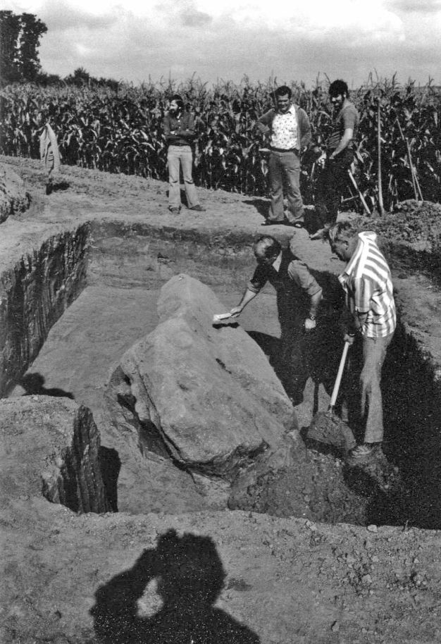 Als er im Frühling 1977 im Darmstädter Echo von der Bergung eines vergrabenen Hinkelsteins bei Klein-Umstadt las, erkannte er die Parallelen und erwirkte daraufhin die Untersuchung seiner eigenen Beobachtung. Es stellte sich heraus, dass er mit seiner Vermutung richtig lag. Unter der Leitung des Grabungstechnikers Norbert Fischer bargen Mitglieder der Forschungsgemeinschaft Schnellerts und der AVA Dieburg, zusammen mit freiwilligen Helfern aus Wersau, den 2,95m langen, 1,50m breiten und 40cm starken Menhir.